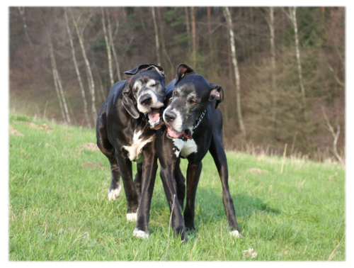 Im Anschluß an die Übungsstunde konnte Lava mit dem Berner Sennenhund Gero und der einjährigen Hündin Joy spielen. Nachdem sie beiden klargemacht hatte, wer in dem Trio die Chefin ist, konnte das Toben beginnen. Nach einer Weile überliess Lava das Spielen den beiden jungen Hunden und holte sich bei den anwesenden Hundehaltern Streicheleinheiten ab. Ihre beiden neu gewonnenen Freunde ließ sie dabei nicht aus den Augen, um jederzeit eingreifen zu können, falls es Streit zwischen den beiden geben sollte. Auch Rothstein lernte Lava heute kennen, einen 14 Monate alten gefleckten Doggenrüden, mit dem Quattro bereits vor zwei Wochen Bekanntschaft gemacht hatte. Rothstein ist ein neuer “Schüler” der Hundeschule, und wir werden ihn nun sicher häufiger dort antreffen.