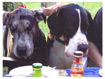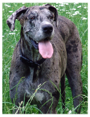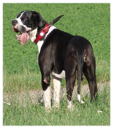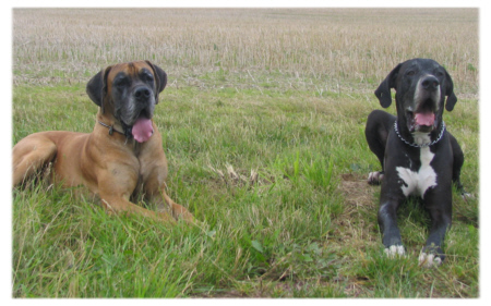 Umso mehr freut es uns, Euch nun berichten zu können, dass Quirinus vor einem halben Jahr endlich sein Zuhause gefunden hat: bei Bettina und Ralf in der Pfalz. Obendrein wartete dort schon Kimy auf ihn, ein dreijähriges Doggenmädchen, mit der Quirinus nun das Sofa teilen darf. In Kimys bis zu zehn Doggen umfassendes Spaziergeh-Rudel hat sich Quirinus problemlos eingefügt. |
