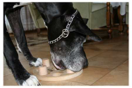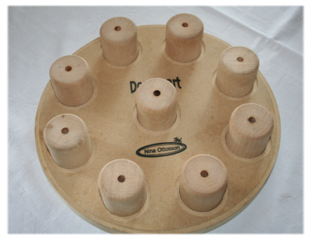 Die Einkerbungen füllt man mit Leckerli und setzt dann die Aufsätze drüber. In jedem Aufsatz befindet sich ein kleines Loch, so dass der Hund die Leckerli riechen kann. Die Aufsätze sitzen so fest, dass der Hund die Aufsätze weder mit der Nasse umstossen noch mit der Pfote herausbekommen kann, sondern nur an die Leckerli gelangt, wenn er die Aufsätze mit den Zähnen heraushebt. Für den Hund besteht die Aufgabe also zunächst darin herauszufinden, wie er an die Leckerli kommt. |