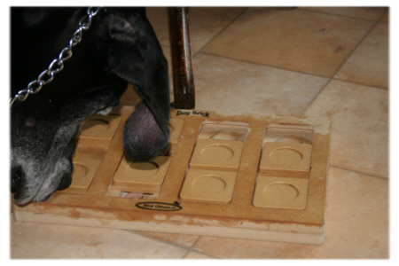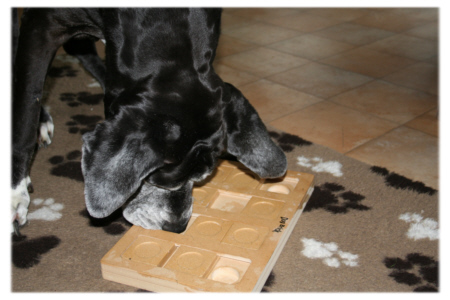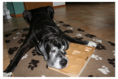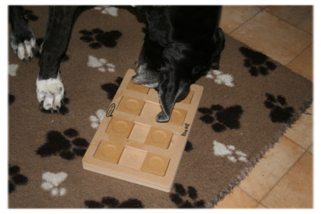 Heute überraschte mich allerdings Quattro, der beim DogSmart noch deutlich länger brauchte als Lava. Er hatte bei DogBrick allerdings eine Technik entwickelt, die wohl von den Erfindern so nicht eingeplant war: Nachdem er mitbekommen hatte, dass die Aufsätze leicht verrutschen, wenn das Spiel gegen ein Hindernis stösst, schob er das Spiel mit Pfote und Schnauze quer durch den Raum, bis es gegen ein Tisch- oder Stuhlbein stiess und die Aufsätze einen Blick auf die Würstchen freigaben, die er sich dann ohne grossartiges Verschieben der Aufsätze schmecken lassen konnte. Ganz schön clever!