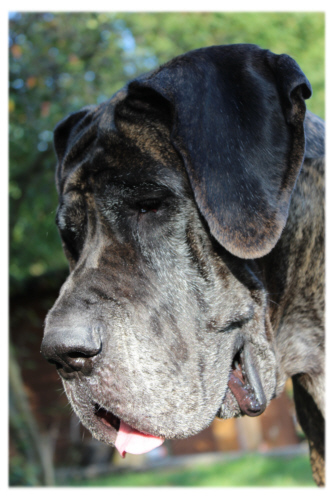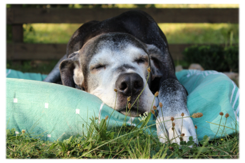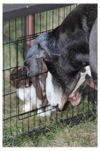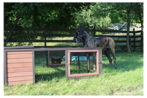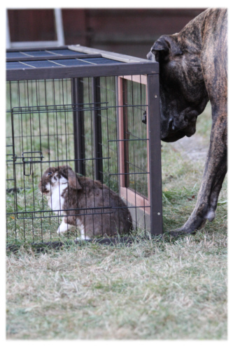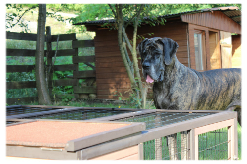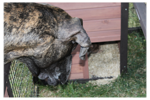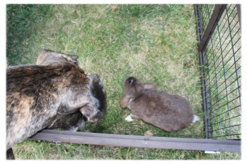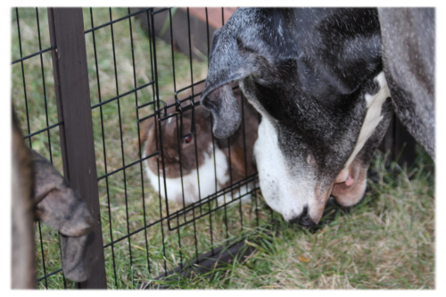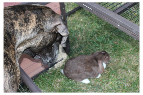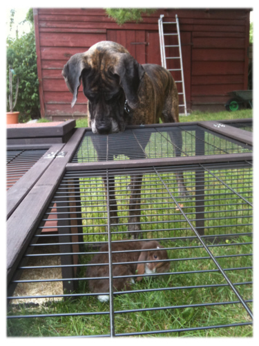 Nach ihrem kurzen Ausflug in die Fernsehwelt hat Ava nun offenbar eine neue Beschäftigung für sich entdeckt: das Hasensitting. Wir haben nämlich für 3 Wochen einen kleinen Gast zur Pflege: das Zwergkaninchen BigFoot meiner Schwester, das sich von einer Tumoroperation erholen muss. Von Anfang an war Ava restlos begeistert von dem kleinen Mitbewohner, was jedoch nicht sofort auf Gegenseitigkeit beruhte. Da BigFoot aber ein recht unerschrockener Zeitgenosse ist, merkte er schnell, dass von den beiden großen Hunden keine Gefahr droht. Kaum dass wir BigFoot bei schönem Wetter in den Garten setzen, ist Ava zu Stelle. Sie bleibt an dem Gehege sitzen oder stehen und lässt sich durch Nichts und Niemanden von ihrer neuen Aufgabe als Hasensitterin abbringen, bis BigFoots Ausflug ins Grüne wieder beendet ist. BigFoot indes scheint die Kur auf dem Land sehr gut zu bekommen, denn er hat bereits zugenommen, was für uns alle sehr erfreulich ist.