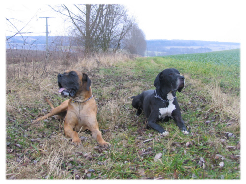 Quattro hingegen genoss es heute wieder in vollen Zügen, mit Bruno toben zu können. “Rette sich, wer kann”, heisst es, wenn diese beiden über die Wiesen fegen. Da geht es in rasantem Tempo bergauf und bergab, über Baumstämme, durch hohes Gebüsch oder einfach querfeldein. Quattros neuestes Hobby ist es, aus vollem Lauf in eine Pfütze zu springen, so dass das Wasser bis zu den Ohren spritzt. In der Regel rennt er dann stolz zu uns und schüttelt sich kaum angekommen so kräftig, dass auch wir gleich aussehen, als hätten wir in einer Pfütze gebadet.