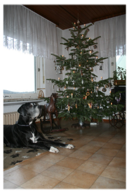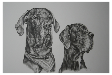 Als ich am Heiligabend das Weihnachtsgeschenk meiner Schwester Christiane auspackte, war ich sprachlos. Was ich sah, war eine wunderschöne Bleistiftzeichnung von Lava und Quattro. Das Portrait stammt von der jungen Künstlerin und Studentin Michaela Frenzel, die über einen Zeitraum von mehr als drei Wochen an dem Bild arbeitete. Eine ganze Packung Bleistifte fand dabei Verwendung. Was dabei herauskam, ist eine Zeichnung, die wohl mein ganzes Leben lang einen Ehrenplatz bekommen wird. Ich hätte nie gedacht, dass man die beiden so originalgetreu abbilden kann. Die Hunde auf der Zeichnung, das sind nicht nur Hunde, die Lava und Quattro irgendwie ähnlich sehen - wenn ich auf das Bild schaue, dann sehe ich genau Lava und Quattro! Jedes Häarchen und jede Falte erkenne ich wieder.