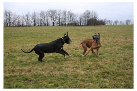 Bruno war wie immer hocherfreut, Lava wiederzusehen. Lava hat es sich mittlerweile angewöhnt, Bruno gleich zur Begrüßung zu zeigen, “wer die Hosen anhat” und dabei benimmt sie sich alles andere als damenhaft. Das mag wohl daran liegen, dass Bruno sich als Lavas hartnäckigster Verehrer erwiesen hat und ihr seine Annäherungsversuche und Sympathiebekundungen manchmal einfach zu viel sind. Obwohl mir Bruno manchmal etwas leid tut, weil er ja (noch) gar nichts gemacht hat und schon gemaßregelt wird, finde ich es doch beeindruckend wie Lava sich in Sekundenschnelle Respekt verschafft. Bruno kann aber den Reizen seiner Angebeteten trotz der anfänglichen Standpauke nicht lange widerstehen. Wird Bruno zu aufdringlich, warnt Lava ihn zunächst mehrfach, beweist aber dabei sehr viel Geduld. Ignoriert Bruno diese Warnungen, kann es schnell passieren, dass er im nächsten Moment aufjault, weil Lava ihn kräftig an Ohr oder Lefze gezogen hat. Dann tut uns Bruno allerdings ganz und gar nicht leid, denn wie heisst es so schön: wer nicht hören will, muss fühlen!