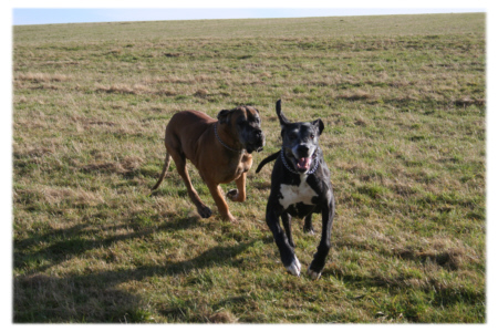 Wir freuen uns sehr, diesen Tag mit Lava erleben zu dürfen, denn allzu selbstverständlich ist es leider nicht, dass Doggen dieses Alter erreichen. Mittlerweile merkt man Lava an, dass sie nun eine Seniorin ist. Sie ist nach wie vor sehr fit, aber ihre Hinterhand ist schwächer geworden, so dass sie nicht mehr umherspringen kann wie ein junges Reh und der Einstieg ins Auto manchmal etwas länger dauert. Aber die Gelenkprobleme treten zum Glück bislang nur selten und kurzzeitig auf. Dennoch lässt sie es sich nicht nehmen, jeden Tag ausgiebig mit Quattro herumzutoben und auch mich hält sie ständig fit mit ihrem Lieblingsspiel, bei dem sie sich ein Spielzeug schnappt und mich animiert, sie zu fangen bzw. mir das Spielzeug zu holen. In der Regel geht es dann mehrere Runden ringsum den Tisch, bis ich einen Drehwurm habe. Bei diesem Spiel hat Quattro in der Regel nur einen Platz auf den Zuschauerrängen. Ich hoffe, dass Lava noch lange so fit ist und wir noch viel Zeit miteinander haben.