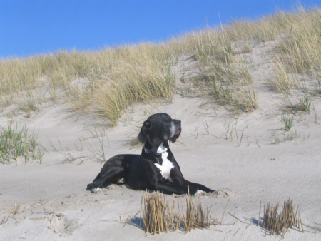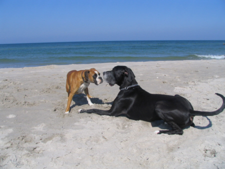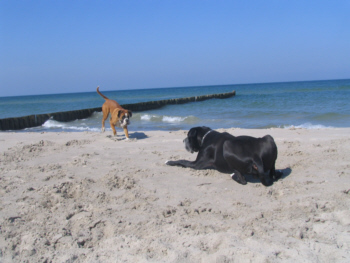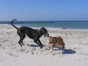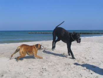 Lilu hatte keine Angst vor der großen Dogge und forderte Quattro immer wieder zum Spielen auf, was dieser sich natürlich nicht zweimal sagen ließ. Lilu gab sich alle Mühe, Quattro dazu zu bewegen, mit ins Wasser zu kommen. Doch, was wir schon so oft versucht hatten, gelang leider auch ihr nicht. Dabei hatte ich immer meine Hoffnung darauf gesetzt, dass Quattro vielleicht seine Angst vor dem Meer verlieren würde, wenn er einen Spielgefährten findet, der ihm zeigt, dass es schön ist zu baden.