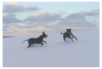 Quattro war heute wieder einmal gemeinsam mit Bruno unterwegs. Es war wie immer eine Freude, den beiden Rüden beim Spiel zuzuschauen. Obwohl Bruno Quattro an Kraft überlegen ist, gelingt es Quattro immer wieder, seine Stärke, die in seiner Schnelligkeit und Ausdauer liegt, so auszunutzen, dass er am Ende triumphiert. Auch für den Fall, dass es Bruno gelingt, Quattro zu Boden zu ringen, hat Quattro sich eine raffinierte Methode ausgedacht, die immer wieder Erfolg hat: Ein kurzer herzerweichender Schrei reicht, um Bruno, der seinen Freund nicht verletzten will, abzulenken. Und ehe sich Bruno versieht, steht Quattro wieder hinter ihm und zwickt ihn frech ins Bein, um ihn so zu einem neuen Spiel herauszufordern.
