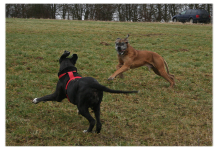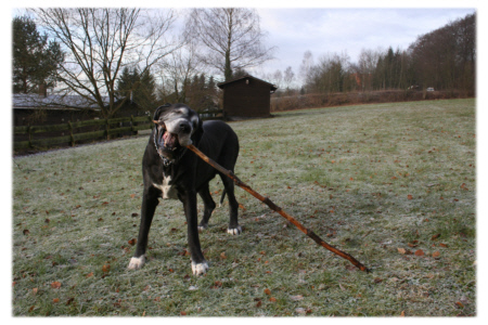 Findet sie ein Stöckchen nach Maß, blüht Lava richtig auf. Stolz wie Oskar trägt sie ihre Beute über die Wiese und spielt ausgelassen damit. Wenn man bedenkt, dass Lava nach ihrer Krankheit aufgrund der Lähmungserscheinungen keine Gegenstände greifen und halten konnte, staunt man einmal mehr, wie sie sich nach und nach wieder erholt hat.