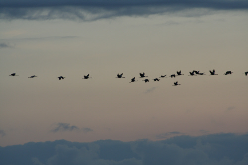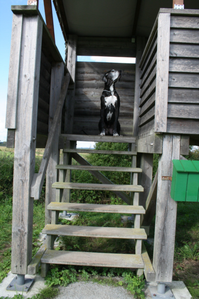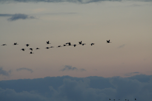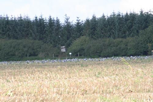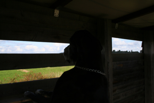 Zunächst war ich etwas skeptisch, eine Unterkunft inmitten der Kranicheinflugschneise zu mieten, da ich nicht wußte, wie Quattro reagiert, wenn täglich tausende Kraniche über uns hinwegziehen. Lava und Quattro veranstalten zuhause bereits ein Riesenspektakel, wenn nur ein kleiner Schwarm Zugvögel sich nach Waldhessen verirrt. Und da auch kleine Schwärme schon viel Krach machen, malte ich mir einen Höllenlärm aus. Doch meine Sorgen waren völlig unbegründet. Quattro liess sich von den vielen Vögeln und ihren trompetenden Rufen nicht aus der Ruhe bringen. Ich hatte meinen “Kleinen” mal wieder unterschätzt. Quattro war die coolste Dogge im ganzen Nationalpark: nachdem ich mich im Kranichinformationszentrum erkundigt hatte, ob es möglich ist, einen Hund mit zum Beobachtungsturm nehmen zu können, war Quattro sowohl beim morgendlichen Abflug der Vögel als auch beim abendlichen Einflug hautnah dabei. Durch seine Anwesenheit auf den “Uitkieks” vergassen manche Vogelfreunde ganz und gar, dass sie wegen der Kraniche gekommen waren.