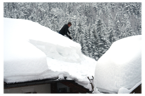 Man nennt Leutasch auch das “Tal, wo der Schnee wohnt”. Wieviel Schnee in diesem Winter dort wohnt, hat auch die Tiroler überrascht. Seit unserer Ankunft schneite es ununterbrochen, und von Tag zu Tag wurden die Schneemassen höher. Was des Skifahrers Freud`, war der Hausbesitzer Leid, denn der Schnee auf den Dächern war nicht ganz ungefährlich. Und so sah man in diesen Tagen viele Einwohner auf dem Dach Schnee schippen. |