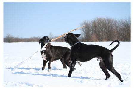 Ihr glaubt nicht, welch große Freude man Lava mit einem Ast machen kann. Während andere Hunde sich mit Stöckchen begnügen, fängt bei Lava ein spieltaugliches Objekt in der Regel erst ab einer Länge von 1,50 Meter an. Frei nach dem Motto “Je größer, desto besser!” rennt sie dann mit dem Ast querfeldein und versucht uns zu animieren, ihr das “Stöckchen” wegzunehmen. In den ersten fünf Minuten hat Quattro keine Chance, den Ast zu bekommen, denn Lava verteidigt ihn vehement. Nach einer Weile darf dann Quattro auch mitspielen.