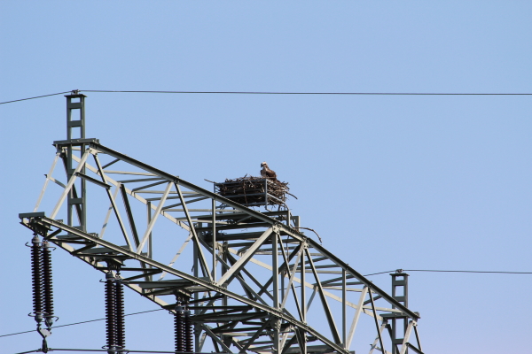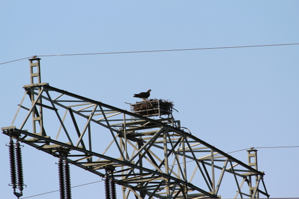 Bereits am Abend unserer Ankunft im idyllisch gelegenen Nationalparkhotel erlebten wir eine Überraschung. Keine 100 Meter vom Hotel entfernt nistete auf einem Hochspannungsmast ein Fischadler-Paar. Während das männliche Tier auf Nahrungssuche unterwegs war, hütete das weibliche Tier den Horst. |
