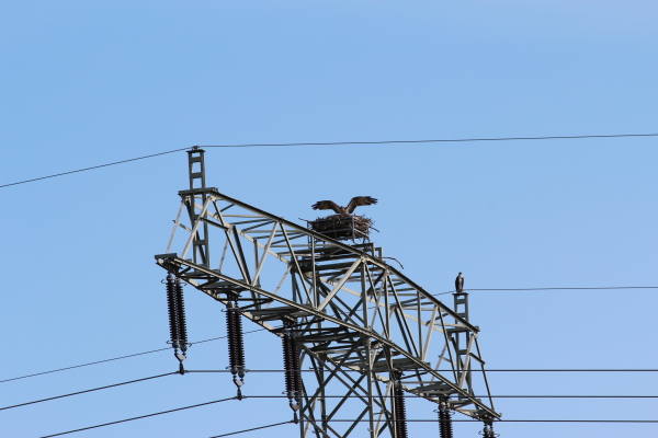 Am nächsten Tag hatten wir auch noch das Glück, beide neben unserem Hotel ansässigen Fischadler beobachten zu können. Es hat uns im Hinblick auf den vergangenen Tag verwundert, dass sich diese beiden Adler überhaupt nicht durch Fußgänger, Radfahrer oder gelegentlich Autos stören liessen, obwohl ihr Horst viel näher an den Menschen lag als der des durch die Kamera permanent “in der Öffentlichkeit stehenden” Paares.