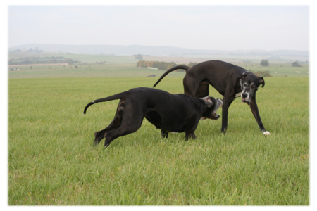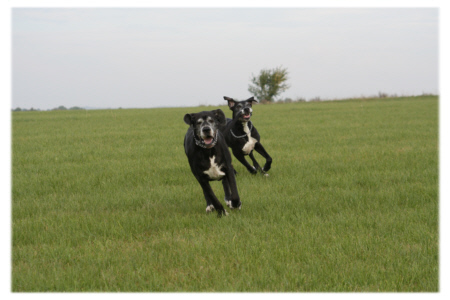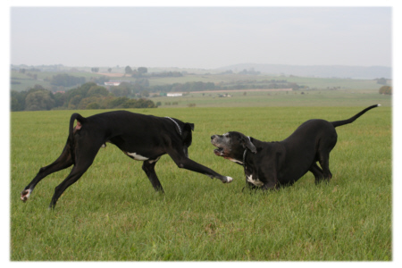 Der Herbst hat Einzug gehalten und die Blätter der Bäume bunt gefärbt. Es ist merklich kälter geworden, und ein kühler Wind begleitete uns heute auf unserem Spaziergang. Es ist immer wieder eine Freude, Lava und Quattro beim Spielen zuzuschauen. Wenn man die beiden sieht, kann man sich nicht vorstellen, dass Lava in ein ein paar Monaten acht Jahre alt wird. Ich weiß nicht, wieviele Doggen in diesem Alter nicht irgendwelche Altersbeschwerden wie Arthrose oder andere Krankheiten plagen, wenn sie überhaupt ein solches Alter erreichen. Derzeit kann man wohl, wie aktuelle Statistiken zeigen, von dem erschreckenden Ergebnis ausgehen, dass die meisten Doggen dass 7.Lebensjahr nicht überschreiten. Lava ist fit wie ein Turnschuh, und dafür bin ich jeden Tag dankbar. Und wenn ich daran denke, dass ihre Mutter Hexe im nächsten Monat ihren 10.Geburtstag feiern wird, dann bin ich guter Dinge, dass auch Lava solch ein stolzes Alter erreichen wird. Beim Raufen steht sie Quattro in nichts nach, und auch bei einem Wettlauf lässt sie sich nicht so leicht abhängen. Ich glaube, Quattro mit seiner stürmischen Art hält sie jung und fit.