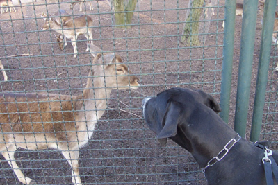 Zunächst wollten uns die Zweibeiner die Elefanten zeigen. Doch am Gehege angekommen, war weit und breit kein Tier zu sehen. Daraufhin sind wir erst einmal weitergelaufen und kamen zur Pferdekoppel. Auch dort war alles leer. Nicht anders erging es uns bei den Kamelen, bei den Nashörnern und bei den Giraffen. Das war vielleicht ägerlich. Ich wollte Alois doch beweisen, daß mein Hals länger ist als der einer Giraffe. Und nun habe ich nicht mal eine Giraffe gesehen. Unsere Frauchen waren nicht gerade erfreut, als sie feststellten, daß am Nachmittag etliche Tiere bereits wieder in ihren Häusern untergebracht werden - und da ist der Zutritt für Hunde verboten. Ich konnte das gar nicht verstehen, wo doch so schönes Wetter draußen war. |