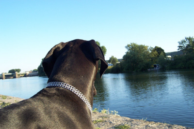 Zusammen mit Yana bin ich dann am Mainufer spazierengegangen. Wir durften sogar ohne Leine laufen und so konnte ich Yana gleich einmal zeigen, wie schnell ich rennen kann. Und Susanne konnte ich zeigen, dass ich mich trotz vieler Radfahrer auch ohne Leine ganz toll benehmen kann. Nur als ein paar Menschen kamen, die Rollen an den Füßen hatten und den Weg entlangrollten, da war ich verdutzt. So etwas hatte ich noch nie gesehen, und da musste ich erst einmal kräftig bellen. Aber nachdem mir Yana erklärt hat, dass das Inlineskater sind, habe ich sie weiterfahren lassen. Nach unserem Spaziergang haben unsere Menschen sich dann in einem Lokal erst einmal gestärkt. Nach einer Weile war mir ganz langweilig, aber zum Glück konnte ich Peter immer mal zu einem kleinen Spielchen herausfordern.