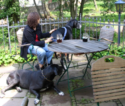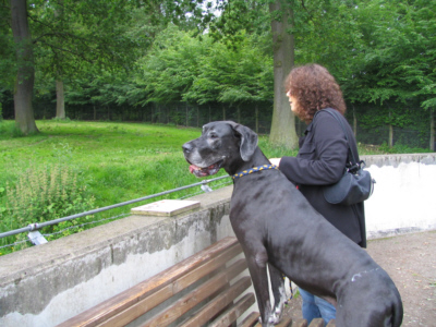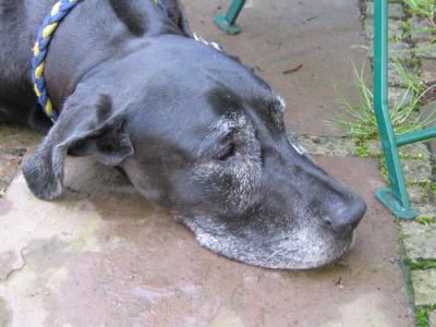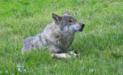 Nachdem wir die Wölfe verlassen hatten, öffnete der Himmel all seine Tore, und es regnete in Strömen. Da die nächste Schutzhütte etwa 5 Minuten Fussweg entfernt war, suchten wir Schutz unter einigen Bäumen, die uns jedoch nach einigen Minuten auch keinen Schutz vor den Wassermassen mehr bieten konnten. So liefen wir dann zur nächsten Schutzhütte und trockneten die Hunde und uns erst einmal provisorisch. Wir mussten lange warten, bis der Regen endlich nachliess. Aber langweilig wurde es nicht, da die anderen Menschen, die die Hütte ebenfalls als Unterschlupf vor dem Regen nutzten, viel über die beiden Hunde wissen wollte, und eine Gruppe Kinder Elly und Quattro streicheln wollte. Elly ließ sich geduldig von einer ganzen Schar Kinderhände streicheln. Quattro hingegen sah wohl den Regen als das geringere Übel an und hatte nichts eiligeres zu tun, als sich einen Platz vor der Hütte zu suchen.