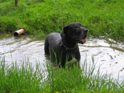 Als der Regen endlich aufhörte, konnten wir unseren Rundgang fortsetzen. Nach einer Weile kam sogar die Sonne zum Vorschein. Als wir an einen Bach kamen, nutzte Elly die Gelegenheit nicht nur zum Trinken, sondern nahm erst einmal ein ausgiebiges Bad.