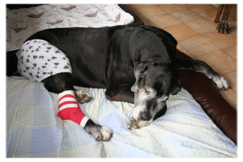 Pechvögelchen Lava ist wieder einmal Stammgast beim Tierarzt. Nachdem vor drei Monaten ihr Vorderlauf geschwollen war, hat sie nun am Hinterbein eine riesige Beule. Glücklicherweise hat sich aber offensichtlich nur Gewebe entzündet und eine Art Höhle gebildet. Wieder einmal kommen Spinnengift und Antibiotikum zum Einsatz und einige Tierarztfahrten sind unabdingbar. Nichtsdestotrotz geht es Lava aber wunderbar, da sie abgesehen von der Schwellung keinerlei Beschwerden zeigt. Wie man an den hippen Boxershorts sehen kann, ist sie allerdings gerade wieder läufig geworden, so dass Quattro langsam seine Koffer für die nächste Reise packen kann.