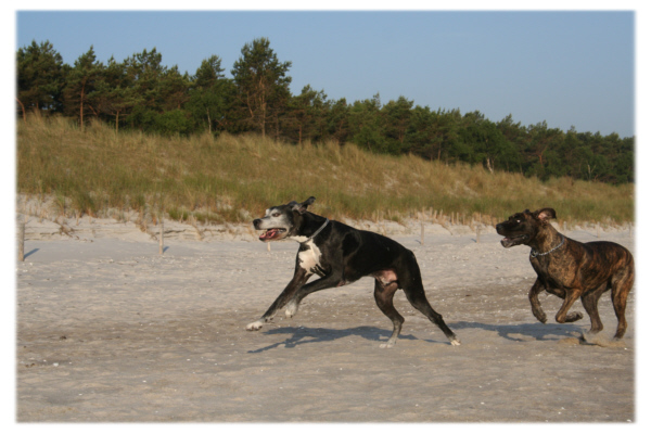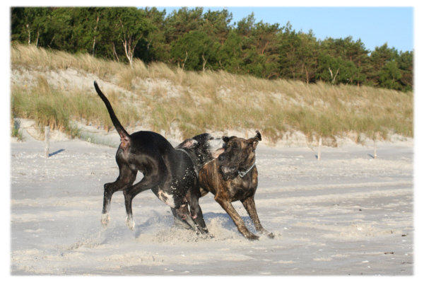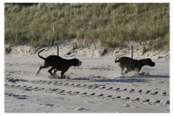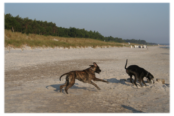 Damit Quattro und Ava bei angenehmen Temperaturen ausgiebig am Strand toben konnten, waren wir morgens um sechs Uhr die ersten Besucher am Hundestrand. Um diese Zeit war der Strand fast immer noch menschenleer, nur einige Hundefreunde und Jogger liessen sich mitunter blicken. |